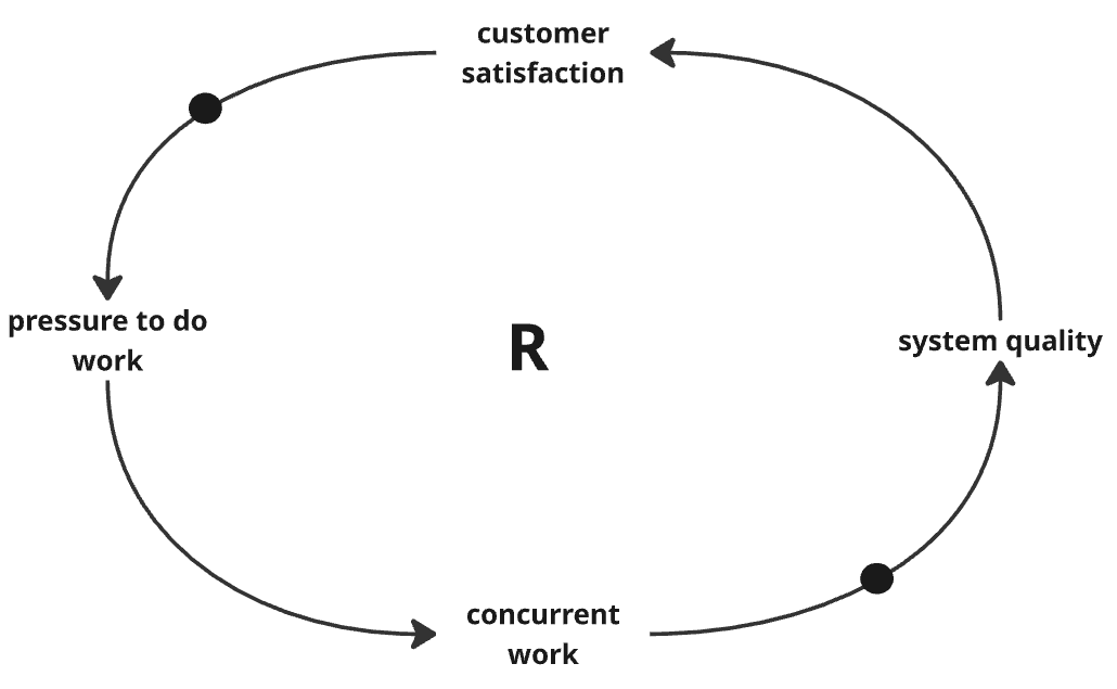 Influence: an arrow connecting two variables means those variables move in the same direction. Example: As “pressure to do work” goes up; “concurrent work” goes up. An arrow with a circle on it means the two connected variables move in opposite directions. Example: As “customer satisfaction” goes down; “pressure to do work” goes up.